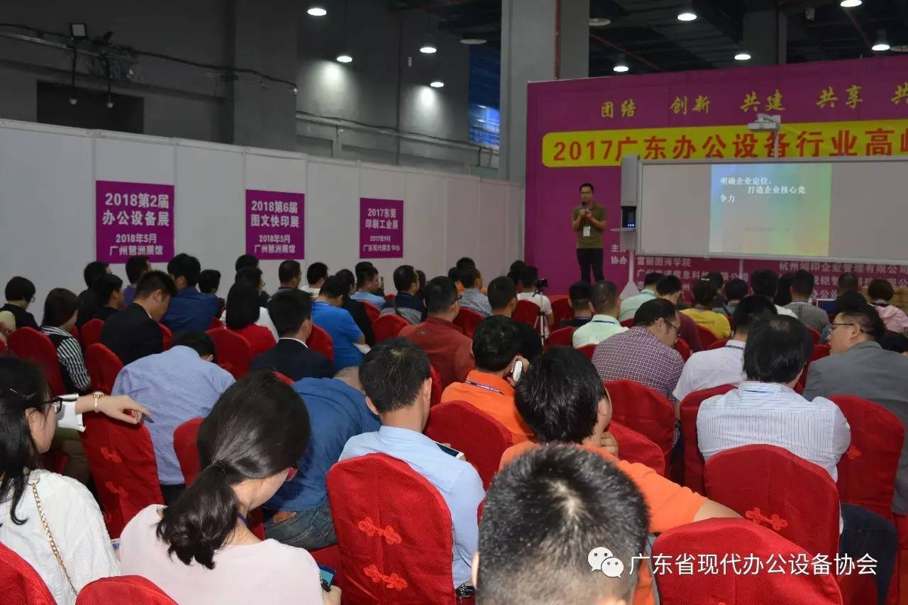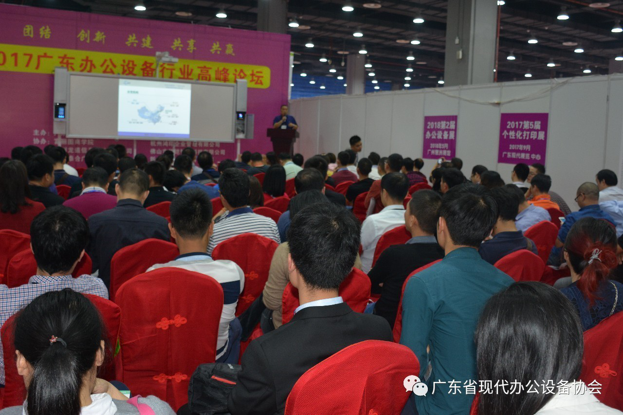 4月15日,备受瞩目的“2017广东省办公设备行业高峰论坛成功举办在广州琶洲国际采购中心展览馆2号馆的论坛室隆重举行,本次论坛由广东省现代办公设备协会主办,广州环之球会展公司承办,广东省现代办公设备协会会长胡锋先生亲任嘉宾主持。会议当天,近200名嘉宾聆听了此次论坛,会上办公设备行业大咖彭国华总经理和叶志华总经理为大家分享了独特而又非常接地气的观点和经验。众多聆听者踊跃提问,主讲嘉宾一一解答,现场掌声不断,精彩迭出。